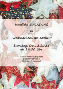 Wie jedes Jahr möchten wir zur Adventszeit in unser Atelier einladen. Die letzten Jahre waren immer ein voller Erfolg – fröhliche Begegnungen, volle Bäuche und der Kauf von einmaligen Geschenken für die Liebsten.