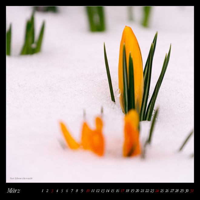 Das Foto der Krokusse ist tatsächlich im März entstanden, nach einem kurzen Wintereinbruch. Der Krokus stand in einem großen Kübel in unserem Garten. Das Kalenderblatt ist Teil des Kalenders „Auf Streifzug 2019“. Aktuell ziert dieses Foto auch unser Schaufenster.